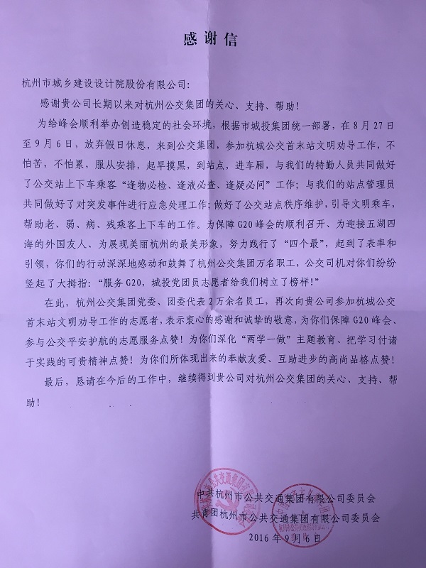 9月20日下午,杭州市城市建設(shè)投資集團有限公司團委副書記和杭州市公共交通集團有限公司團委書記專程將一封感謝信和一面錦旗交到公司領(lǐng)導手中。為杭設(shè)股份的志愿者們在G20峰會保障工作期間,參與公交平安護航志愿服務(wù)點贊。公司董事長高重建和副院長康平接受錦旗,并且表示今后將一如既往發(fā)揚志愿服務(wù)精神工作。為美麗杭州、魅力杭州,添光加彩。